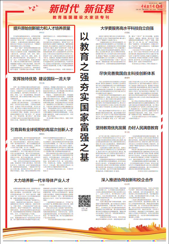 作为教育强国建设的龙头,高等教育要紧紧围绕中国式现代化的中心任务,瞄准世界科技前沿和“国之大者”,以造就拔尖创新人才为突破口,以服务国家和区域发展重大战略、服务高水平科技自立自强为着力点,不断提升原始创新能力和人才培养质量。