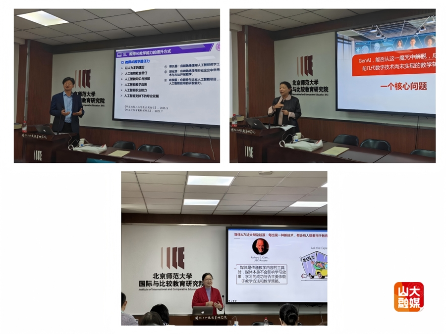清华大学韩锡斌教授作“教师AI教学能力的内涵及其提升方法”特邀报告,华东师范大学赵健教授作“技术进化论视野中的数学转型:可能与路径”特邀报告,北京大学汪琼教授作“媒体&方法:智能时代的教学研究”特邀报告。