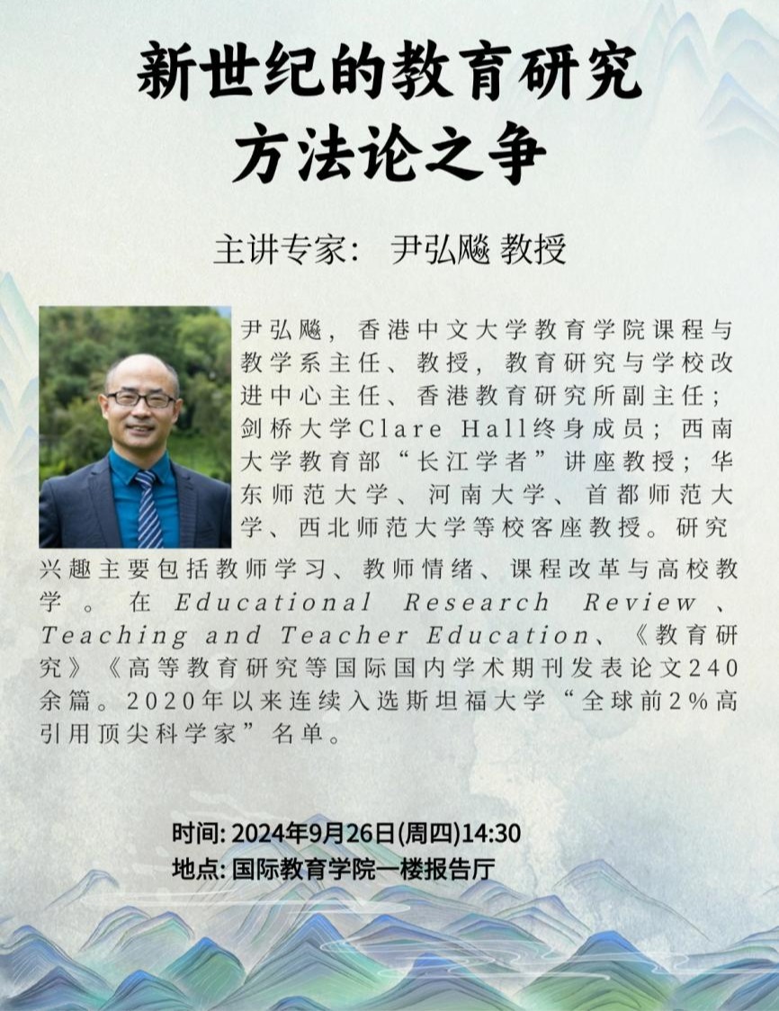 尹弘飚,香港中文大学教育公司课程与教学系主任、教授,教育研究与公司改进中心主任、香港教育研究所副主任;剑桥大学Clare Hall终身成员;西南大学教育部“长江学者”讲座教授;华东师范大学、河南大学、首都师范大学、西北师范大学等校客座教授。研究兴趣主要包括教师学习、教师情绪、课程改革与高校教学。在Educational Research Review、Teaching and Teacher Education、Higher Education、《教育研究》《高等教育研究》《华东师范大学学报(教育科学版)》等国际国内学术期刊发表论文240余篇。2020年以来连续入选斯坦福大学“全球前2%高引用顶尖科学家”名单。