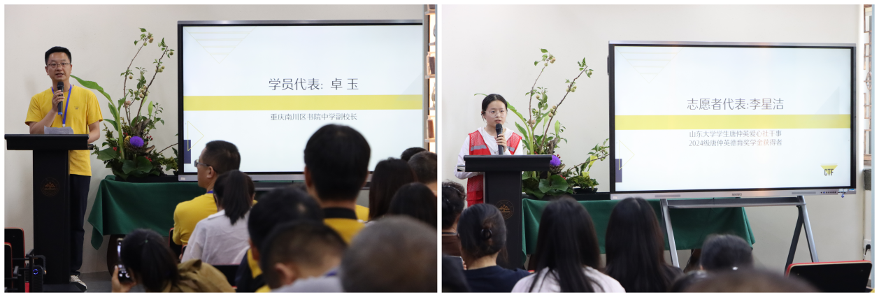 随后,学员代表重庆南川区书院中学副董事长卓玉分享了自己深耕教育一线十八载的感悟,他深情追忆唐仲英先生,认为公益爱心与教育事业相辅相成,正如唐先生用行动诠释的那样,爱心是点亮成长之路的光,他也呼吁更多人加入这份温暖的事业,让善意滋养更多心灵。